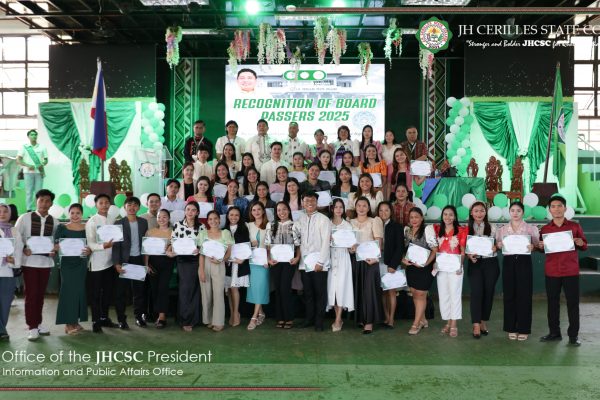 The J.H. Cerilles State College (JHCSC) campuses held a series of recognition activities honoring the 2025 Board and Civil Service passers. The program was spearheaded by Prof. Venus Avenido, Dean of the Office of the Student Affairs and Support Services (OSASS), and was facilitated by the OSASS Department Heads of each campus, with the support of the visionary leadership of President Dr. Edgardo H. Rosales. The activity recognized the academic achievements of JHCSCians who successfully passed their respective licensure and eligibility examinations.