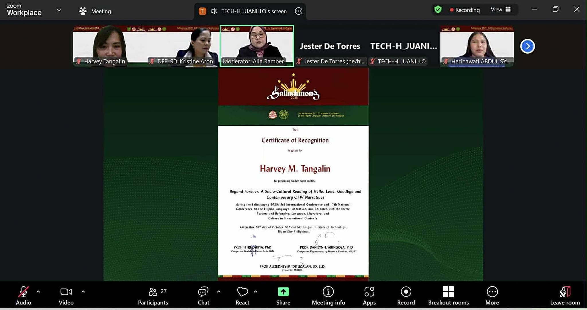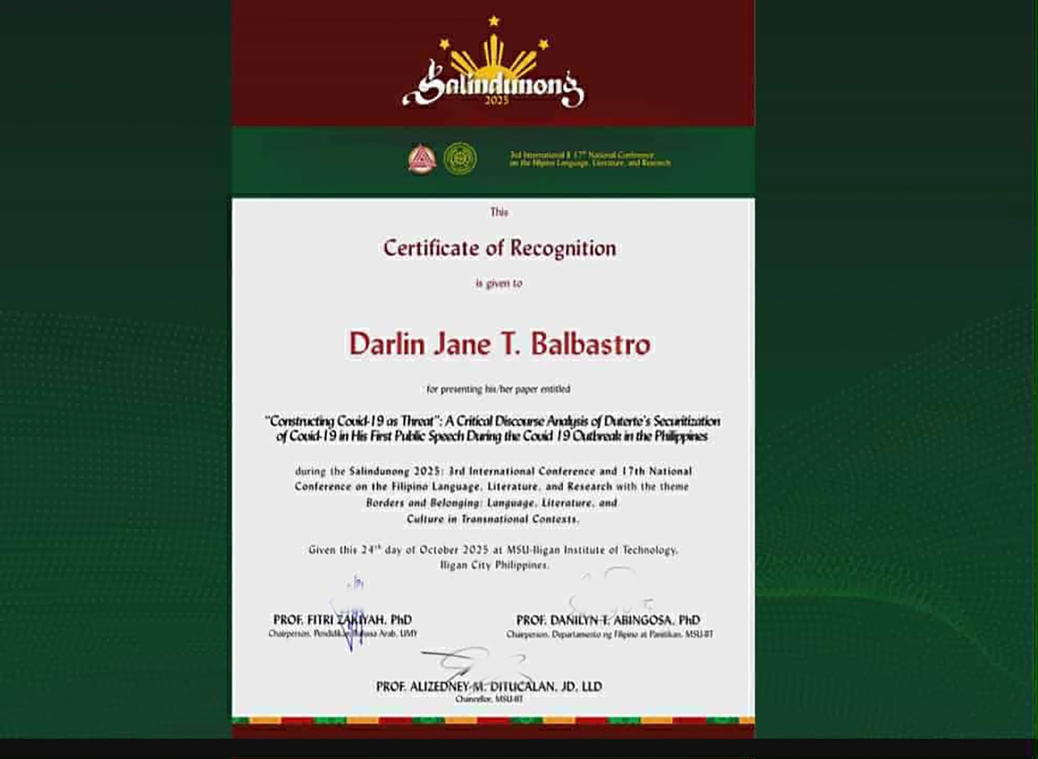 Prof. Tangalin, MAEd, shared his paper titled โBeyond Forever: A Socio-Cultural Reading of Hello, Love, Goodbye and Contemporary OFW Narratives.โ Her study examined how modern Filipino films reflect the experiences, challenges, and aspirations of overseas Filipino workers, providing a deeper understanding of how cinema influences and shapes the collective national consciousness. Meanwhile, Prof. Balbastro, MAEd, presented her research, โConstructing COVID-19 as Threat: Duterteโs Securitization of COVID-19 in His First Public Speech During the COVID-19 Outbreak in the Philippines,โ which analyzed the language used by political leaders in framing the pandemic as a national security issue.