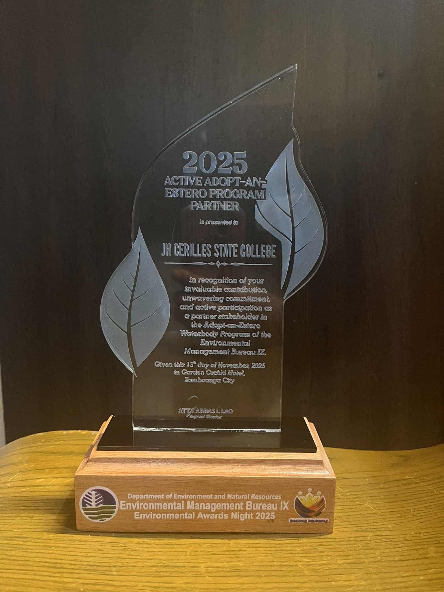 The J.H. Cerilles State College (JHCSC) โ Pagadian City Extension Campus has been awarded as one of the 2025 Active Adopt-An-Estero Program Partners by the Environmental Management Bureau (EMB) IX of the Department of Environment and Natural Resources (DENR). The recognition, particularly under the Water Quality Management category, was presented during the Environmental Awards Night on November 13, 2025, at the Garden Orchid Hotel in Zamboanga City.