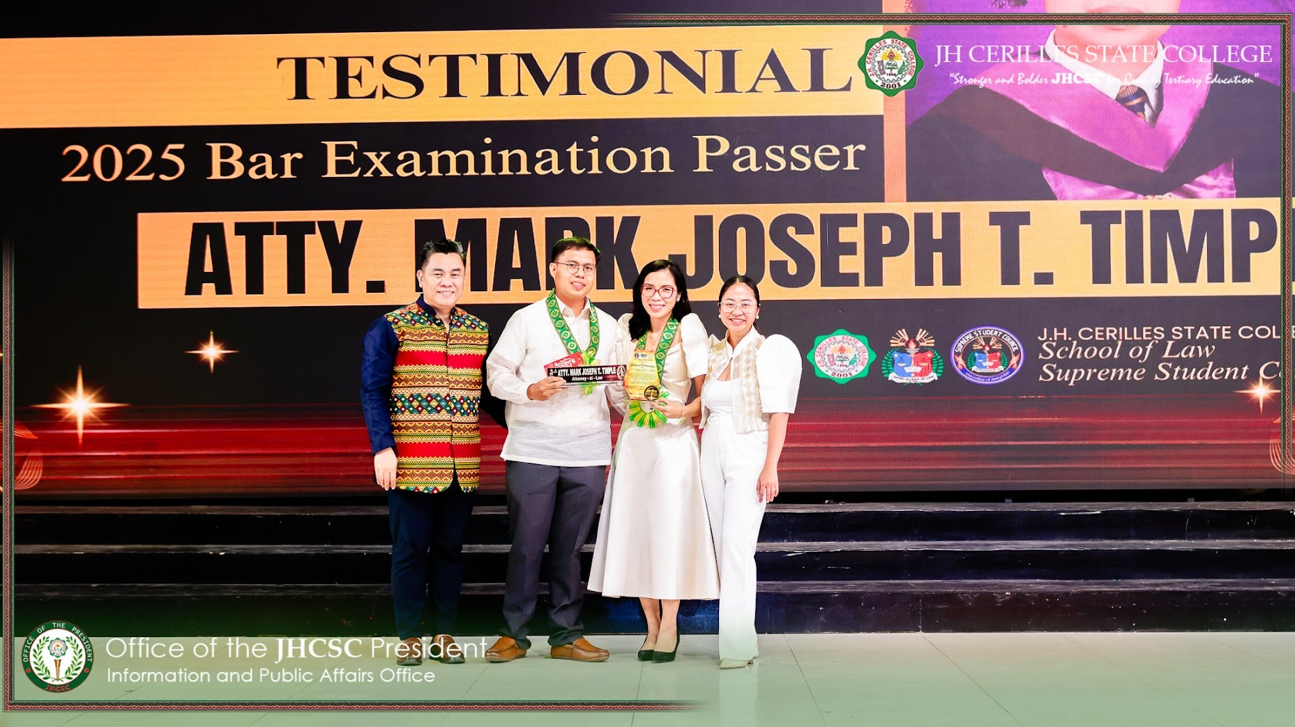 The JHCSC School of Law hosted a Testimonial and Appreciation Night honoring the September 2025 BAR Examination passers on February 1, 2026, at Pavilion Hall in Dao, Pagadian City. The event celebrated the academic achievement and perseverance of newly admitted lawyers who successfully hurdled one of the country’s most challenging professional examinations. It was organized by the School of Law Supreme Student Council (SoL–SSC) under the leadership of its president, Warson I. Buen, and held under the guidance of School of Law Dean Atty. Romylyn O. Regidor, with the support of JHCSC President Dr. Edgardo H. Rosales, represented by his executive secretary, Ms. Prym Crio D. Postrero, and Provincial Governor Hon. Divina Grace C. Yu, represented by Hon. Michelle Espina-Villanueva, Board Member of the 1st District of Zamboanga del Sur.