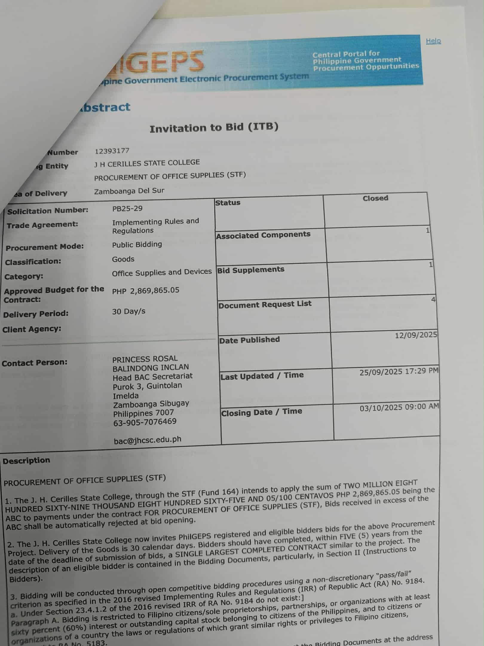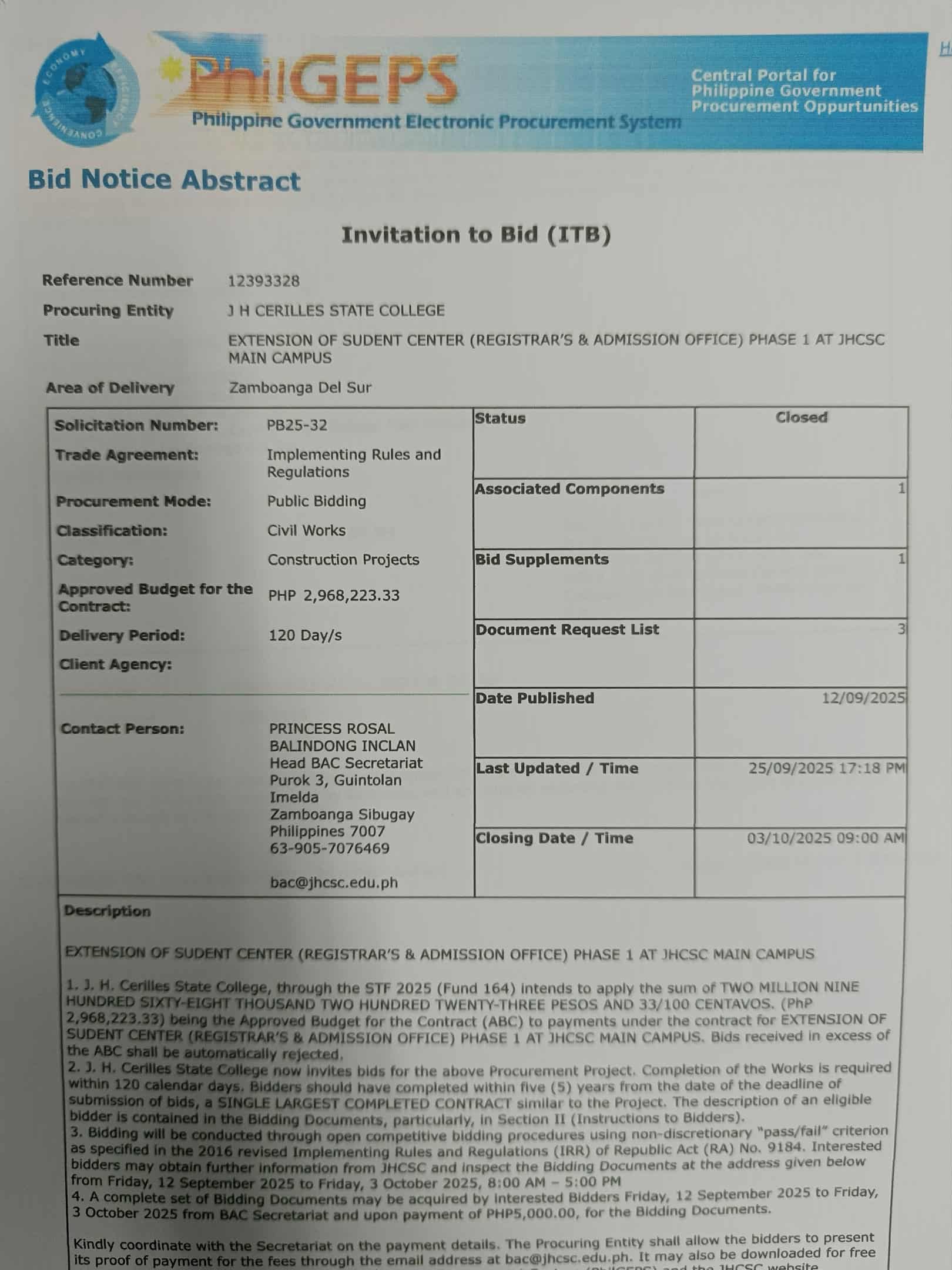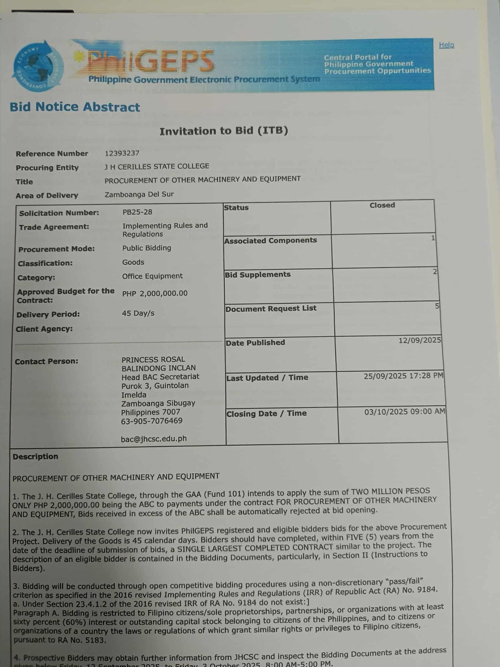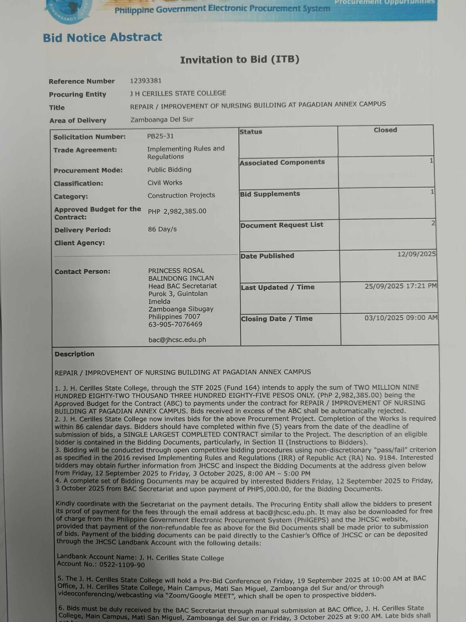 Invitation to Bid, Bidding Documents, Bid Bulletin: Amendment on Sections I, II, and VII, Bid Bulletin: Postponement of Bid Opening, Notice of Award, Approved Contract, Notice to Proceed